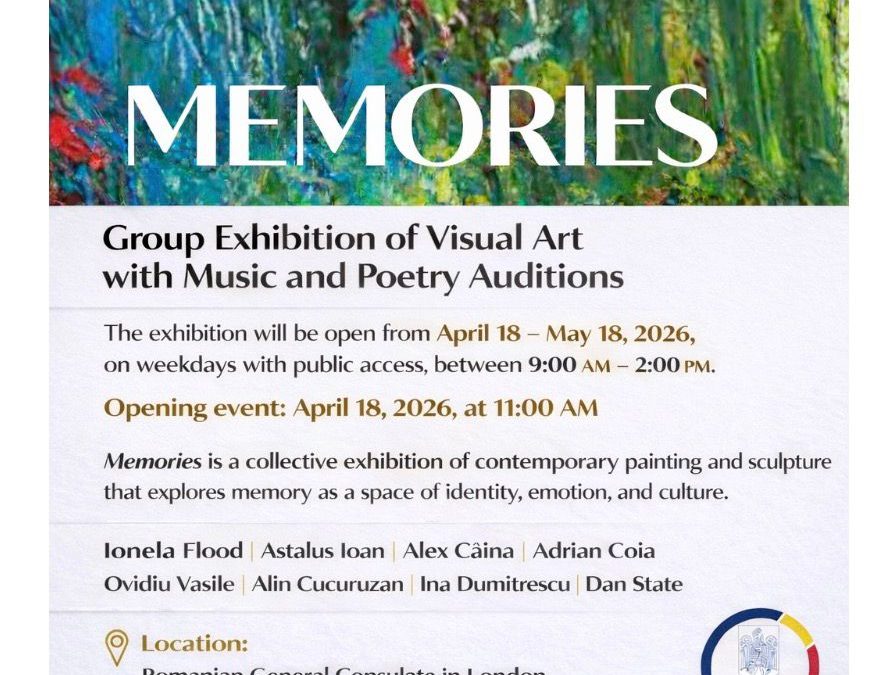 Consulatul General al României la Londra împreună cu Ionela Flood vă invită la vernisajul „Amintiri”, care va avea loc pe 18 aprilie 2026, ora 11:00. Invitat special: Grupul Sublim, cu un recital de muzică și poezie ce va completa atmosfera artistică. „Amintiri” este o expoziție colectivă de pictură și sculptură […]